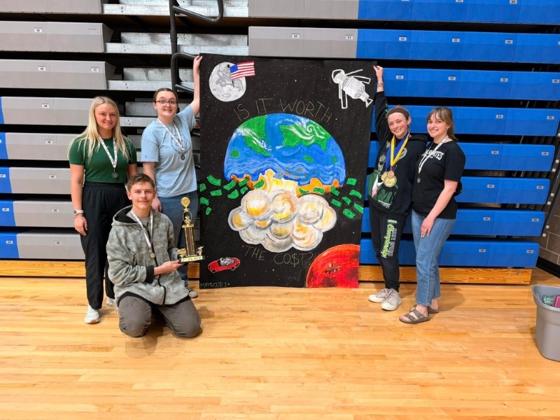 Congratulations to our Maywood Art 3 students! These students traveled to McCook Community College on April 10th for the annual Paint-In held every April. At this event, students get 2.5 hours to paint a themed mural and compete against other schools and their teams. The theme was “Ripple Effect” and there was 19 schools and 29 teams. Maywood Team #1 was Emma Peterka, Graci Peterka, Johnny Valentin, Katie Domes, and Dallas Grunden. They won 2nd place overall in the painting competition. Maywood Team #2 was Gwen Rutherford, Joseph Small, Jayden Harig, and Shelby Vogt.